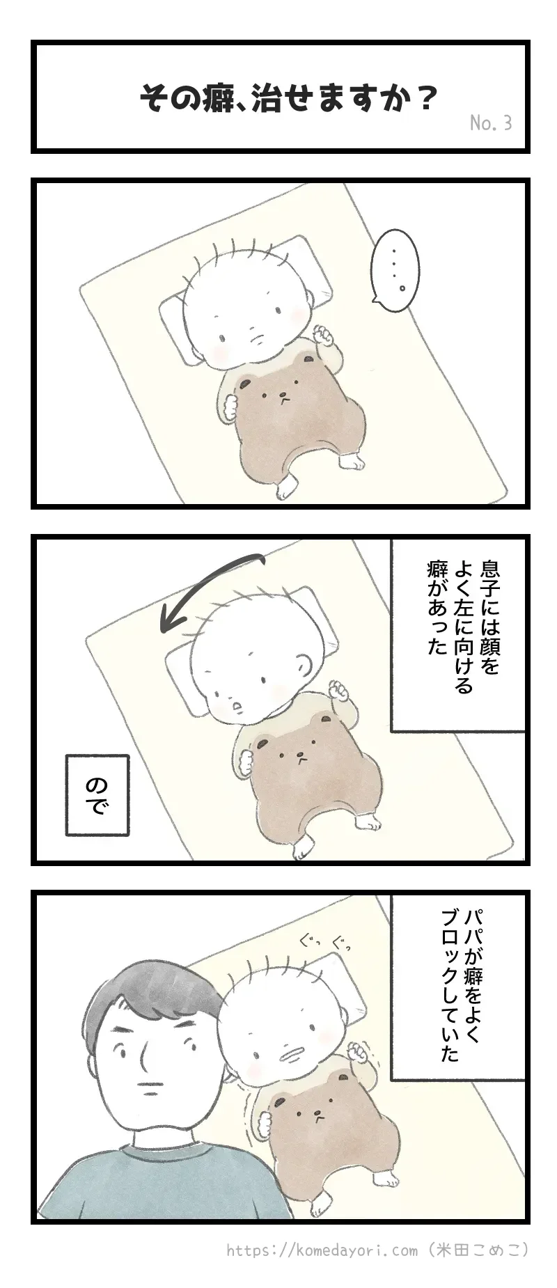 首を横に向ける0歳の息子の癖を直すため、パパが奮闘するする3コマ漫画