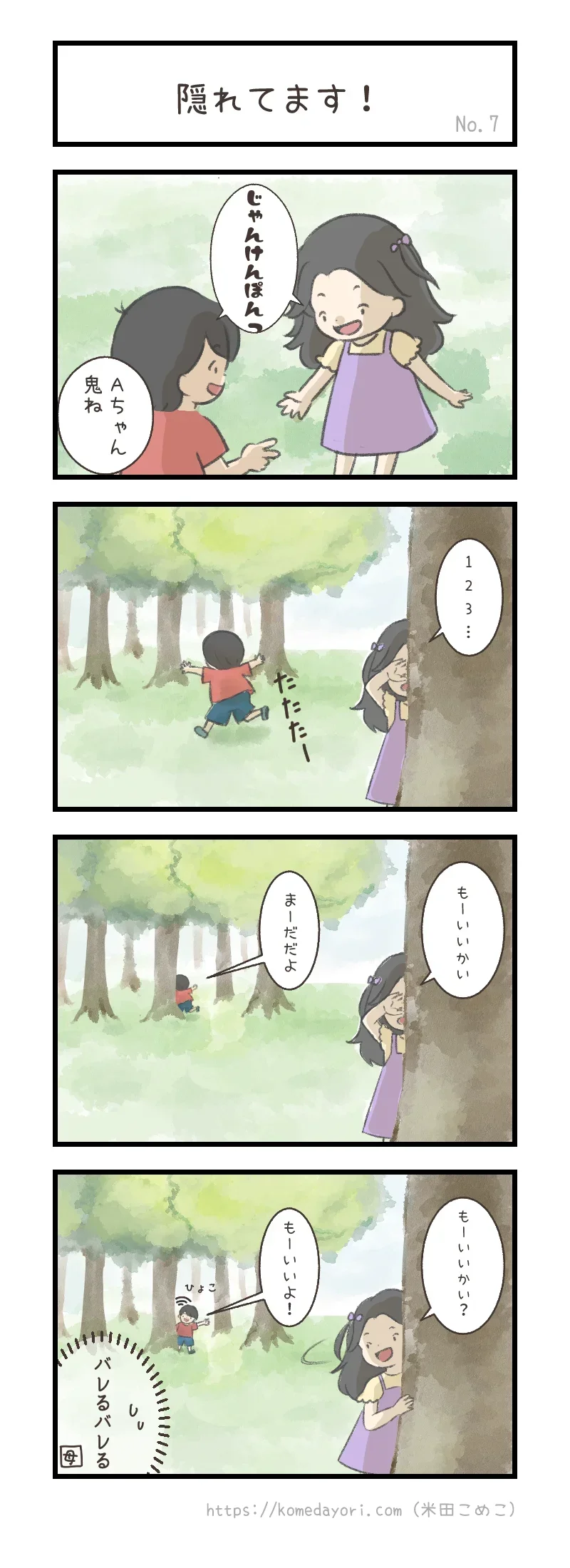 3〜4歳の息子が友達とかくれんぼ。隠れているつもりがバレバレで、母はドキドキ。無邪気さに笑ってしまう4コマ漫画