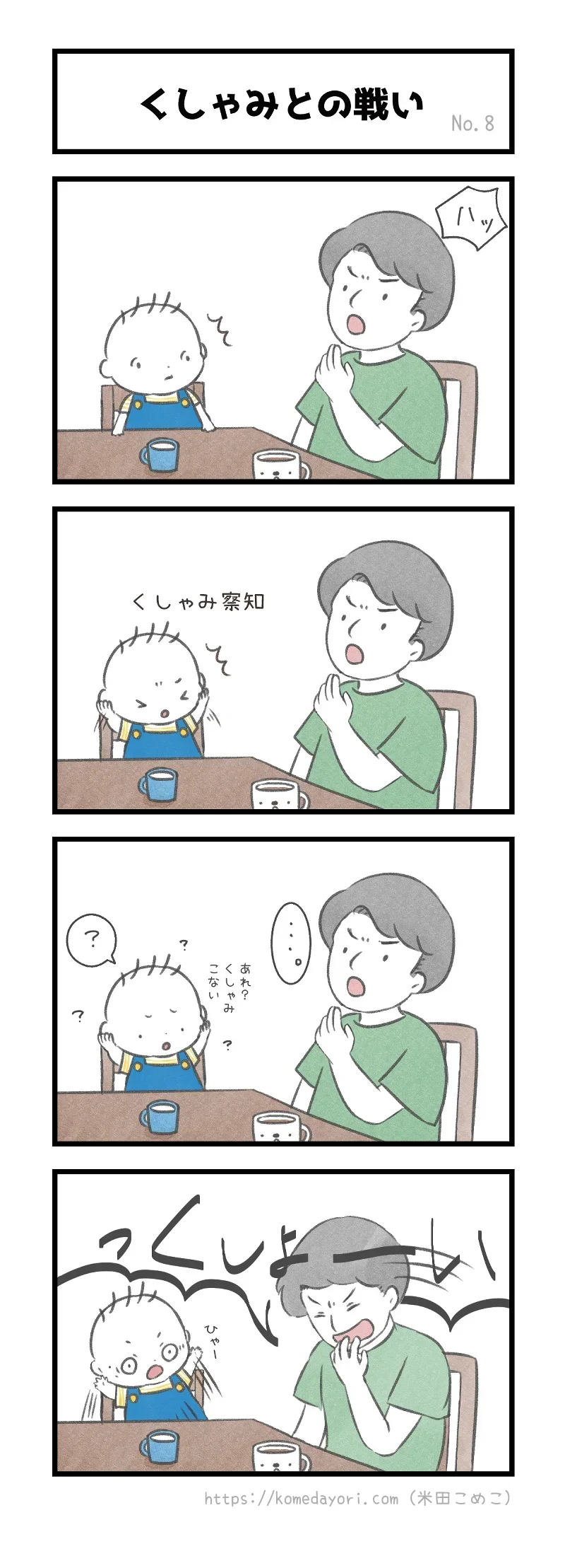 今回は息子が0歳のころのエピソードです。パパのくしゃみをめぐって繰り広げられる、ちょっとした“戦い”を描きました。