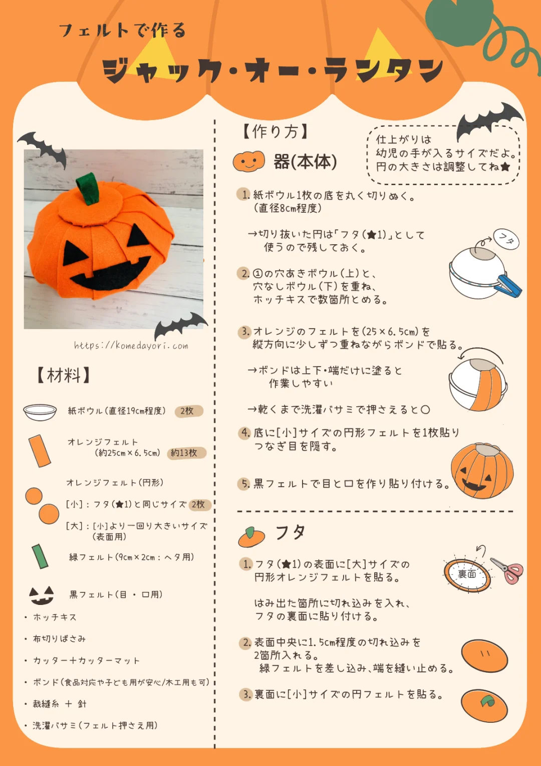 フェルトで作るジャック・オー・ランタンの作り方をまとめたレシピ画像。材料と作り方がイラスト付きで説明されている